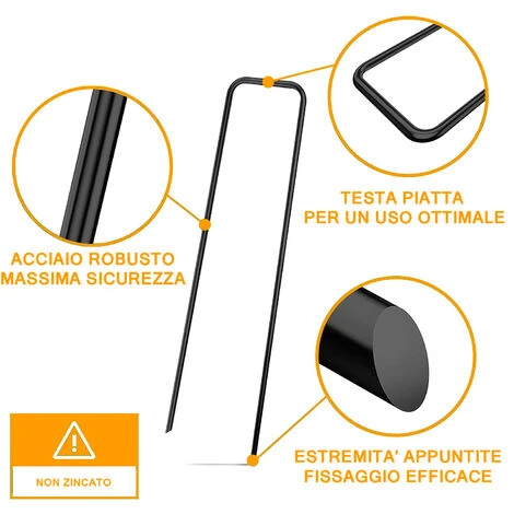 Picchetti in robusto acciaio temprato non galvanizzato, ideali per il fissaggio a terra di teli, tubi da irrigazione o prati sintetici.