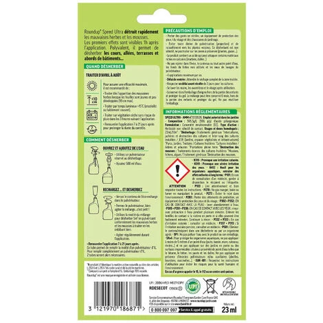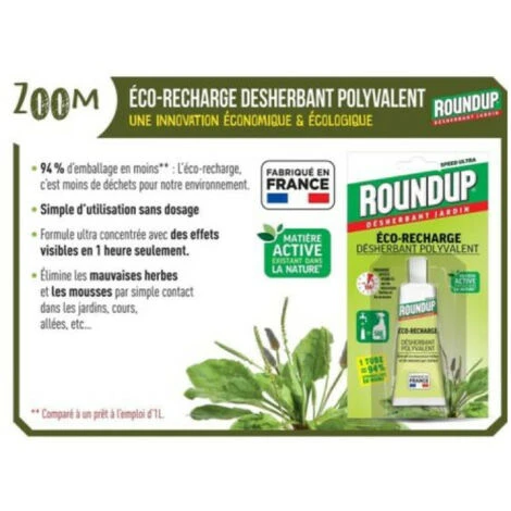 Presentazione Questa ricarica ecologica di diserbante multiuso ROUNDUP – 23ml è un diserbante che elimina muschio ed erbacce per contatto. Questo prodotto può essere utilizzato senza alcuna preparazione preliminare e in tutte le aree del giardino. Diserbare ai piedi di arbusti o aiuole, prima di creare o rinnovare un orto o un prato; è possibile seminare o ripiantare 1 giorno dopo l’applicazione. I primi risultati sono visibili dopo solo 1 ora. Consigli Utilizzare un irroratore riservato al controllo delle erbe infestanti Applicare alla comparsa delle infestanti quando le foglie sono giovani e poco sviluppate (10 cm al massimo). Per garantire la massima efficienza, si raccomanda di : Trattare con tempo luminoso > 15°C (soleggiato o leggermente coperto) Ripetere l’applicazione da 7 a 21 giorni dopo per prolungare la durata del controllo. Vantaggi Pronto all’uso Eco-riempimento, 1 tubo = 94% di imballaggio in meno Risultati visibili entro 1 ora Ideale per piccole aree da diserbare Prodotto in Francia Caratteristiche Utilizzo: da aprile ad agosto 1 tubo per 100 ml di acqua Capacità: 23 ml Rif. RDESECOT Imballaggio Una ricarica ecologica di diserbante multiuso ROUNDUP – 23 mlConsegnato nella confezione originale