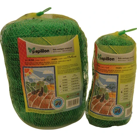 DescrizioneRete di sostegno per ortaggi, rampicanti e fiori a gambo lungo- Maglia rettangolare da 17×15 cm. – Peso 95 gr./mq. – Colore verde- Conf. self service in rotoli