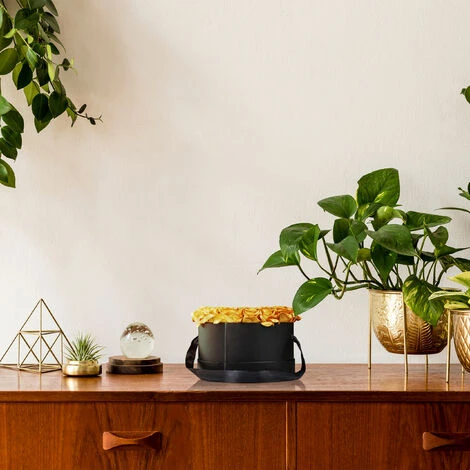 L’elegante scatola con rose è l’evoluzione moderna del classico mazzo di rose che ti permette di godere ogni giorno della vista di meravigliosi fiori. La combinazione tra la scatola nera a forma di cuore e le 18 rose dorate porta un tocco di eleganza ovunque tu la metta. Il bouquet di rose è ideale come centrotavola per feste speciali, come anniverasi o matrimoni, ma anche come regalo per altre occasioni romantiche o per compleanni – la realizzazione a mano dei fiori offre un piacere duraturo per anni.