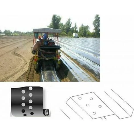 Spessore telo: 0.05 mm.Colore nero.Larghezza:120 cm. Dotato di fori ogni 40 cm.Diametro foro: 8 cm.Passo 30 cm.